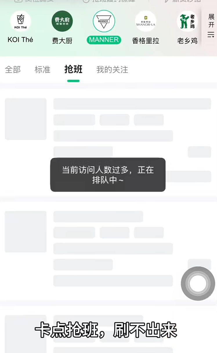 “搶班難,難于上青天!痹(jīng)以為在搶鄧紫棋、林俊杰等一眾頂流明星的演唱會的時候,已經(jīng)見識過人類手速的巔峰,結果沒想到Manner兼職的難搶程度又一次刷新了認知!皳尠嗲耙环昼姡到y(tǒng)就開始卡。好不容易進去了,班次也卡沒了。”