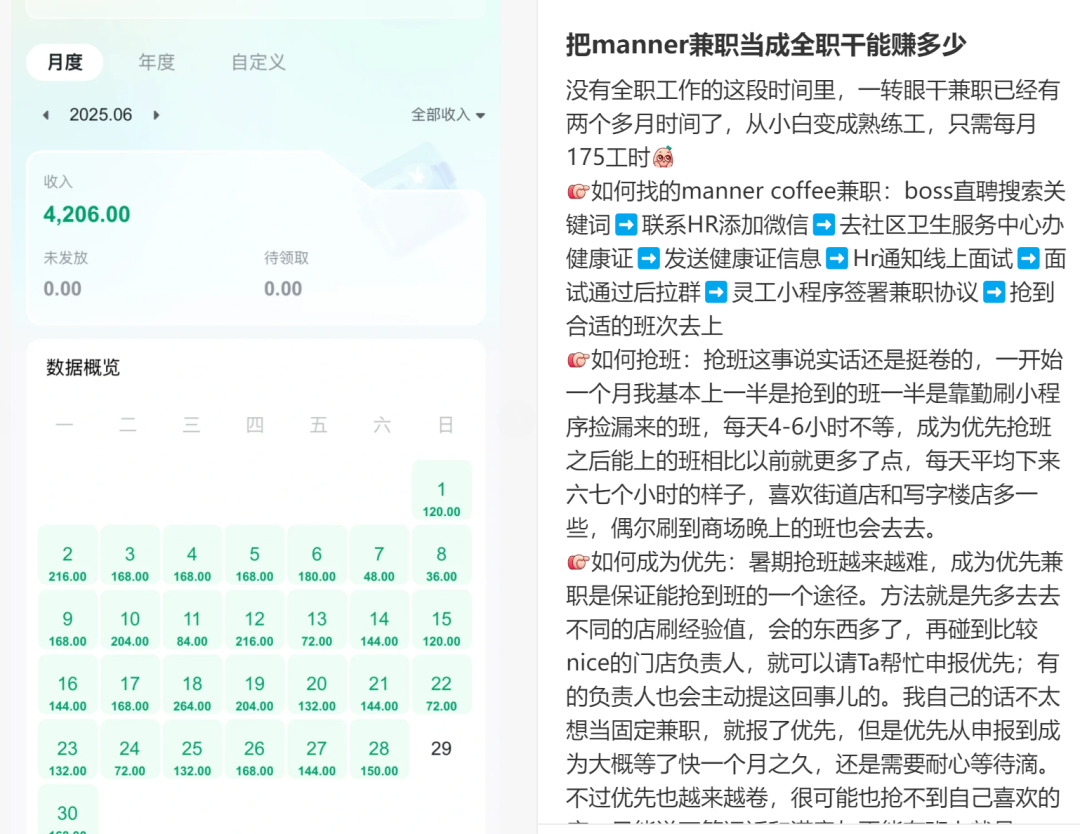 更有趣的是,劉瑤也算過一筆賬,“一個新入職的Manner員工,在上海月到手約6000元,拋開五險一金的話,時薪約30多元。在上海的Manner兼職最低時薪就高達25元。Manner兼職的高性價比無疑又為“搶班熱潮”添了把火。