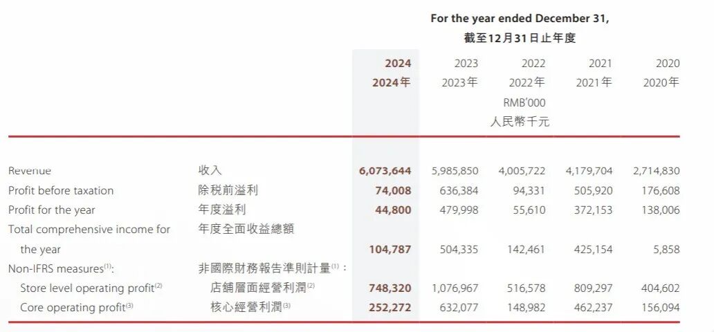 財(cái)務(wù)數(shù)據(jù)清晰印證了這一壓力。2023年至2024年,集團(tuán)營(yíng)收從59.86億元微增至60.74億元,增速顯著放緩;同期店鋪層面凈利潤(rùn)則從10.77億元下滑至7.48億元,呈現(xiàn)收縮態(tài)勢(shì)。