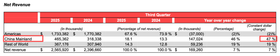 2,分區(qū)域來看,美國市場依舊疲軟,銷售額下降2%,但中國市場銷售額大增47%,占整體營收比例也達到了18.1%,高基數(shù)的前提下同店銷售額亦維持了25%的高增長。