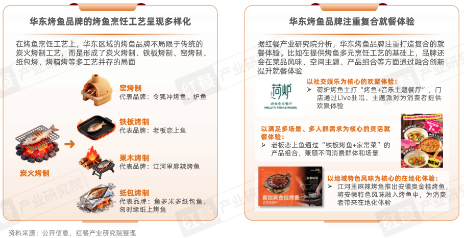 從產(chǎn)品方面來看,華東烤魚品牌在烹飪工藝上展現(xiàn)出技術(shù)多元化的創(chuàng)新趨勢,突破了傳統(tǒng)炭火烤魚的單一模式,形成了紙上烤魚、爐烤、窯烤、鐵板燒等多種技法并存的格局。從消費(fèi)體驗(yàn)的打造上看,華東烤魚品牌注重為消費(fèi)者提供復(fù)合的就餐體驗(yàn),通過品類融合、地域風(fēng)味融合的方式提升就餐體驗(yàn)。