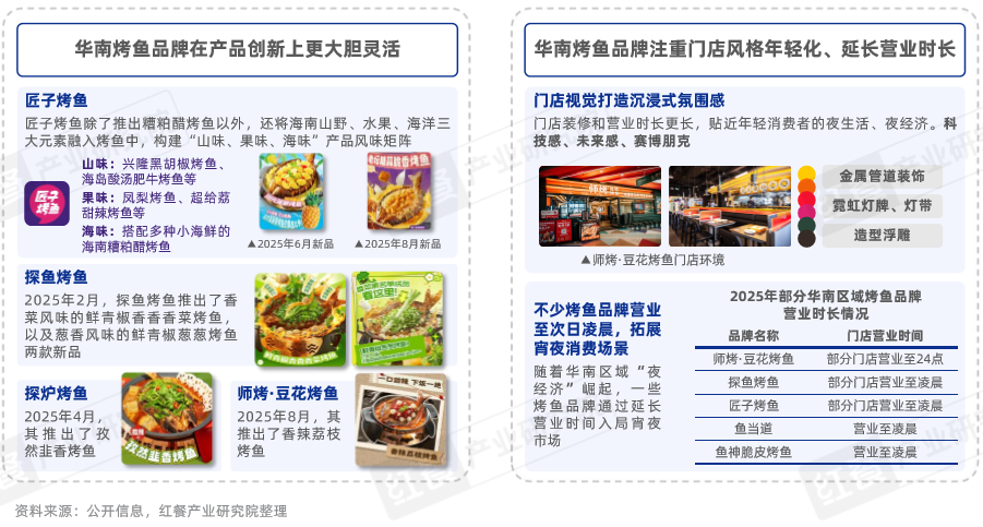 此外,近年來華南烤魚品牌通過產(chǎn)品創(chuàng)新和門店年輕化策略構(gòu)筑差異化競爭優(yōu)勢,精準(zhǔn)觸達(dá)年輕消費(fèi)群體。在產(chǎn)品端口,品牌在口味研發(fā)和菜品創(chuàng)意上持續(xù)發(fā)力,不斷嘗試跨界融合、創(chuàng)新調(diào)味和特色食材應(yīng)用,形成獨(dú)特的產(chǎn)品賣點(diǎn),以滿足年輕消費(fèi)者對新奇、多樣化餐飲體驗(yàn)的追求。