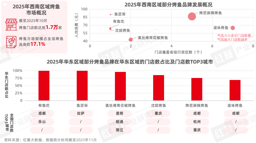西南區(qū)域不僅是烤魚的發(fā)源地,還是烤魚品類的主要消費(fèi)市場。據(jù)紅餐大數(shù)據(jù),西南區(qū)域的烤魚市場份額占全國的17.1%,截至2025年10月,其烤魚門店數(shù)達(dá)到1.7萬家。