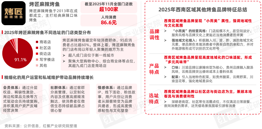 烤匠作為西南區(qū)域表現(xiàn)突出的烤魚品牌,其主打川渝經(jīng)典麻辣口味,并以Z世代為核心消費(fèi)群體,通過精細(xì)化的用戶運(yùn)營,近年來受到消費(fèi)者及行業(yè)內(nèi)廣泛關(guān)注。據(jù)紅餐大數(shù)據(jù),截至2025年11月,其全國門店數(shù)超過100家。除烤匠之外,大多數(shù)西南烤魚品牌普遍呈現(xiàn)小而美、地域化、煙火氣強(qiáng)的本地化經(jīng)營模式特征。