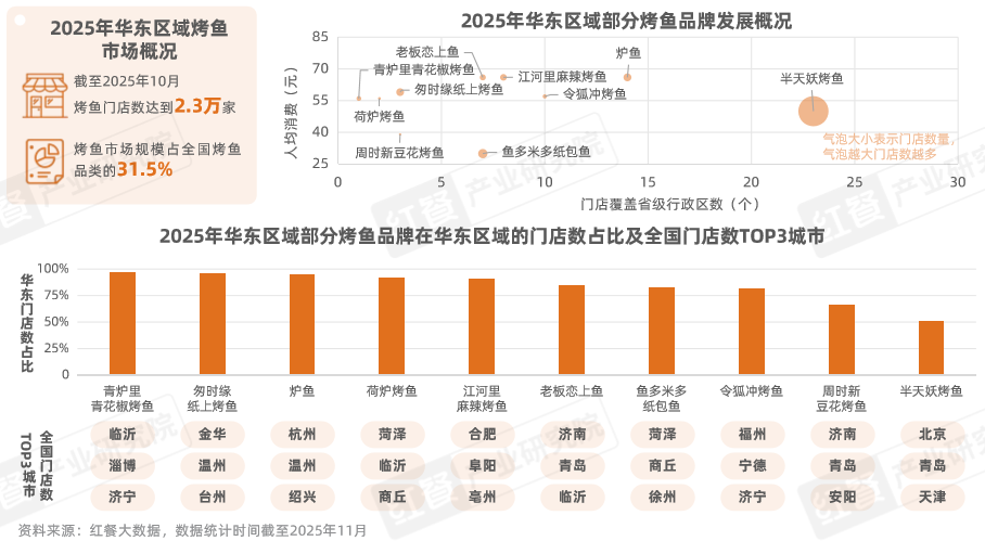 據(jù)紅餐大數(shù)據(jù),截至2025年10月,華東區(qū)域烤魚市場份額占全國的31.5%,烤魚門店達(dá)到2.3萬家。以華東區(qū)域?yàn)橹饕?jīng)營腹地的烤魚品牌有半天妖烤魚、爐魚、老板戀上魚、令狐沖烤魚等。