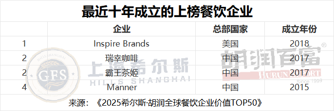 成立十年以?xún)?nèi)的餐飲企業(yè)有4席,其中有3個(gè)是中國(guó)企業(yè),分別是瑞幸咖啡、霸王茶姬和Manner。