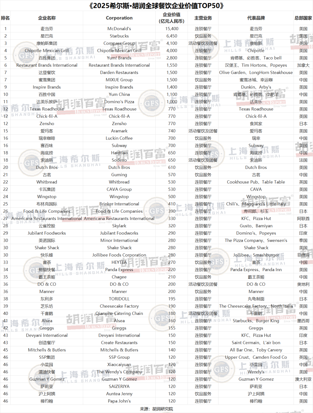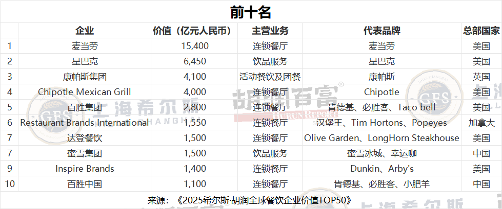 這份《2025希爾斯·胡潤(rùn)全球餐飲企業(yè)價(jià)值TOP50》基于企業(yè)市值或估值進(jìn)行排名。