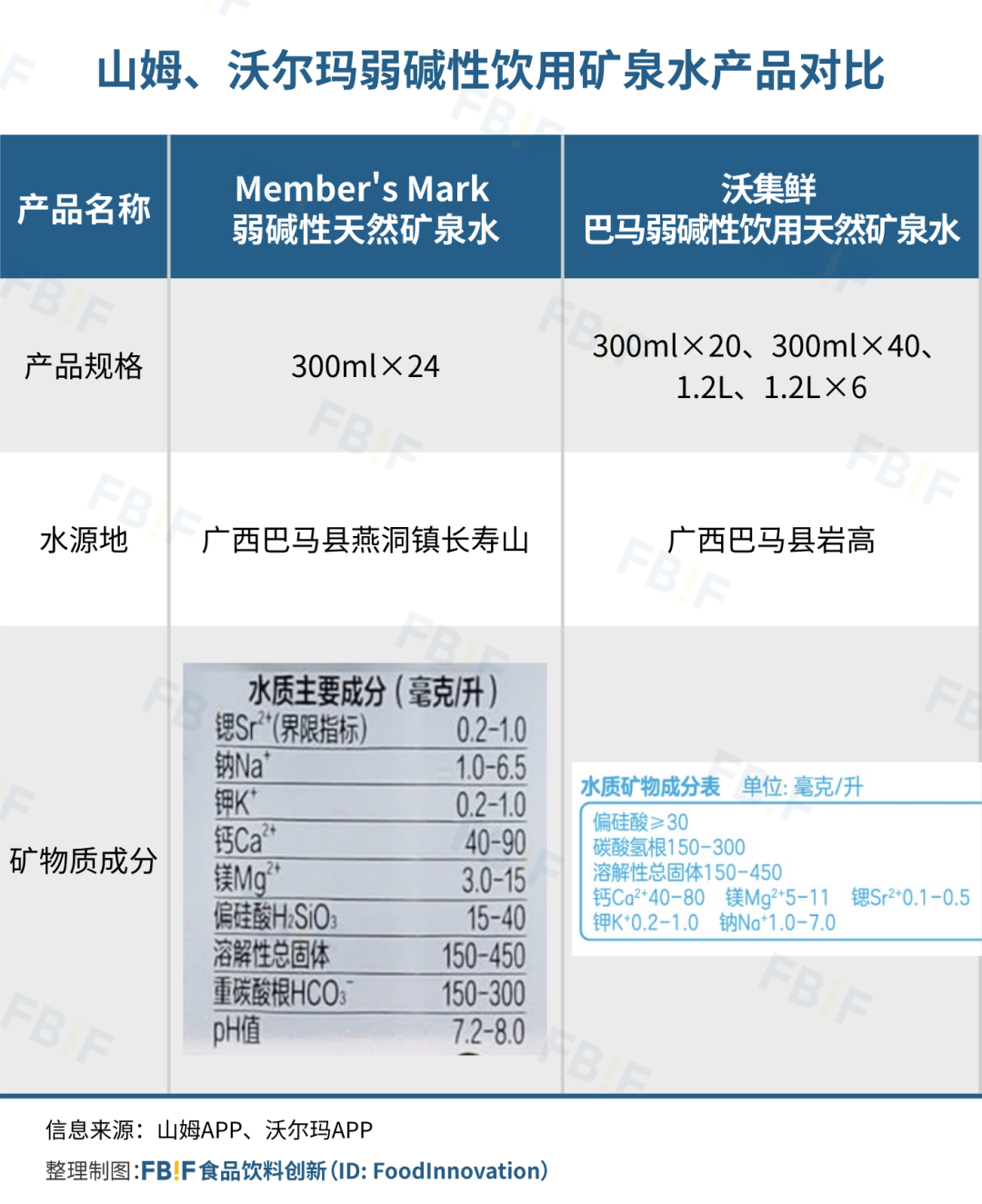 左圖為「沃集鮮巴馬弱堿性飲用天然礦泉水」,右圖為「Member's Mark 弱堿性天然礦泉水」 圖源:沃爾瑪APP、山姆APP