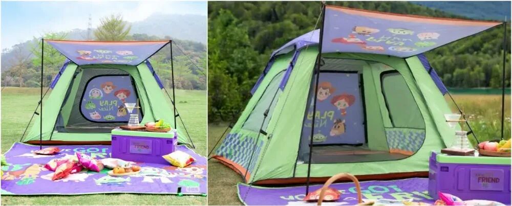 除了食品飲料之外,在沃爾瑪?shù)纳顓^(qū)和玩具區(qū)也能看到“山姆的影子”。例如,2024年4月前后,山姆上線了一款聯(lián)名迪士尼《玩具總動員》的帳篷,而2025年12月,沃爾瑪也上新了一款聯(lián)名迪士尼《玩具總動員》的帳篷。而這兩款帳篷不論是聯(lián)名的元素設計、配色和樣式都十分接近。