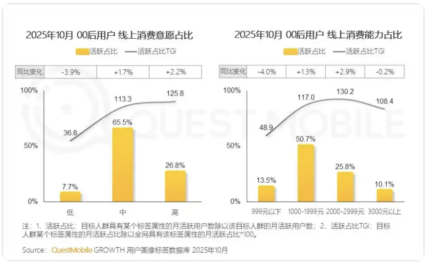 以10月的數(shù)據(jù)為例,中高消費(fèi)意愿的00后占比接近95%,展現(xiàn)出穩(wěn)定的消費(fèi)意愿與強(qiáng)勁的消費(fèi)能力。