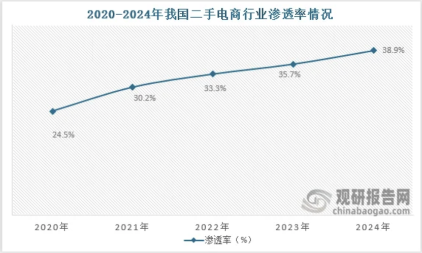 二手電商的滲透率也在不斷提升,從滲透率來看,2020年到2024年我國(guó)二手電商行業(yè)滲透率從24.5%增長(zhǎng)到了38.9%。