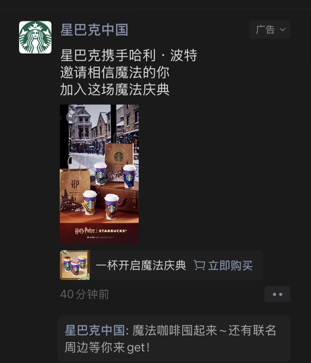 此外,我也連續(xù)幾天,都在朋友圈刷到了星巴克中國的朋友圈廣告。