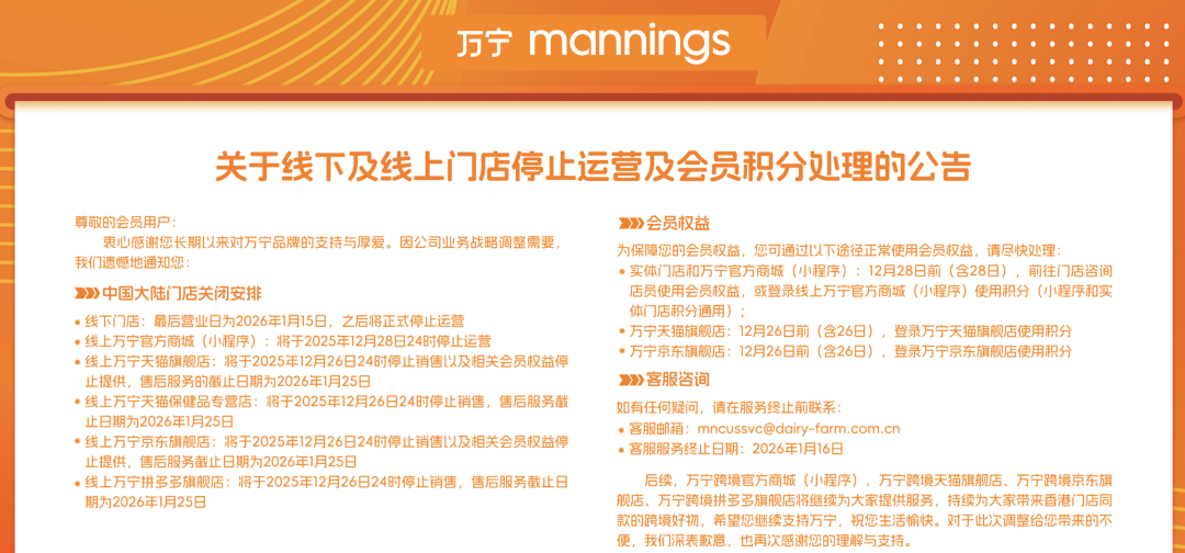 根據(jù)萬(wàn)寧在官網(wǎng)發(fā)布的公告,其線下門店將于2026年1月15日終止運(yùn)營(yíng);線上官方商城(小程序)12月28日24時(shí)停運(yùn),天貓、京東、拼多多等旗艦店則于12月26日24時(shí)停止銷售,售后服務(wù)均延續(xù)至2026年1月25日。