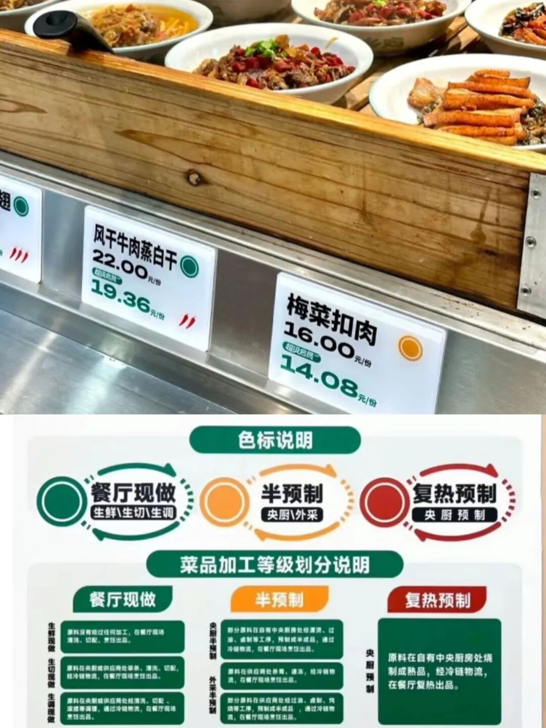 在這點上,老鄉(xiāng)雞為行業(yè)做出了榜樣,首創(chuàng)的“紅綠燈”公示體系收獲了消費者的贊譽:綠色標簽代表現(xiàn)做菜品,黃色為中央廚房半成品,紅色為完全預(yù)制菜。
