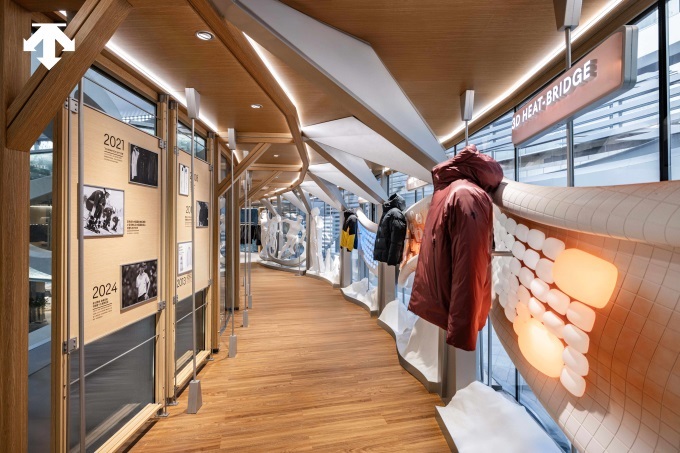 連廊一側(cè)展示HEAT NAVI®、3D保溫系統(tǒng)、SCHEMATECH等核心服裝科技,另一側(cè)則呈現(xiàn)品牌發(fā)展過程中的重要里程碑節(jié)點。通過材料、結(jié)構(gòu)與圖文信息的組合呈現(xiàn),品牌多年在功能創(chuàng)新與產(chǎn)品研發(fā)層面的積累得以清晰展示。