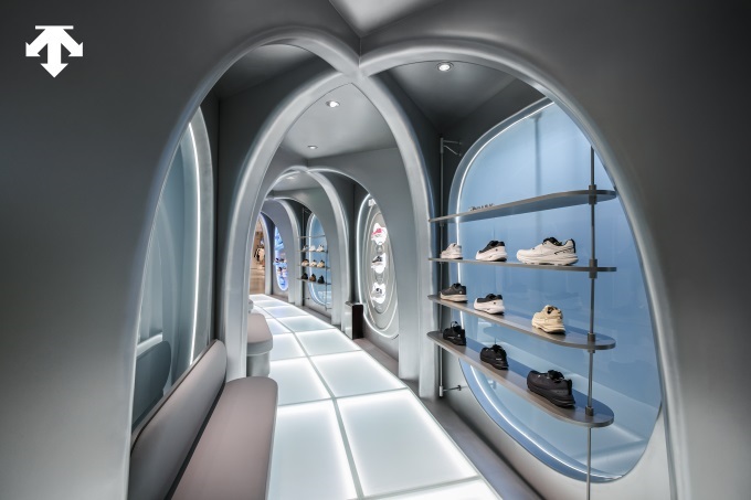 連接高爾夫與兒童區(qū)域的連廊空間,以流暢連續(xù)的造型語言串聯(lián)不同運動場景。空間以連續(xù)弧形結(jié)構(gòu)勾勒出清晰的前行動線,墻面與展示單元在行進過程中形成明確的方向引導,增強整體行走節(jié)奏與體驗連貫性。連廊內(nèi)以半封閉展示形式呈現(xiàn)鞋履產(chǎn)品,并結(jié)合具有未來感的艙體造型設計,使展示界面在滿足功能性的同時,強化空間的整體視覺特征。