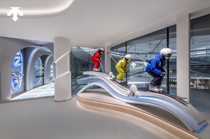 一層核心位置設置有“水晶球”裝置,透明球體內(nèi)包裹雪花意象與品牌標識,如同被封存的冰雪記憶,承載著關(guān)于運動、探索與夢想的最初想象。在“未來之城”的整體路徑中,兒童空間既是旅程的終點,也象征著新的起點。迪桑特希望通過這一溫和而富有想象力的場域,使品牌所堅持的冰雪精神與匠心理念,在代際之間自然流轉(zhuǎn),持續(xù)生長。