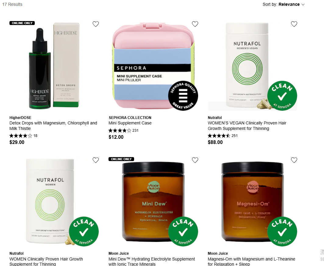 但增長(zhǎng)勢(shì)態(tài)并未持續(xù)太久。近年來(lái),絲芙蘭的補(bǔ)充劑貨架開始悄然變化:多個(gè)中小品牌陸續(xù)下架,品類SKU持續(xù)精簡(jiǎn)。截至發(fā)稿前,絲芙蘭美國(guó)官網(wǎng)顯示的美容補(bǔ)充劑產(chǎn)品僅剩17款,已不足20款,與巔峰時(shí)期的上百款形成鮮明對(duì)比。