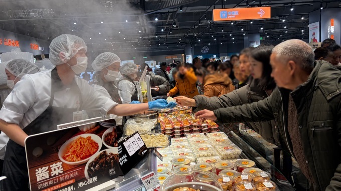 如果說生鮮區(qū)是品質(zhì)的展示場,那么熟食烘焙區(qū)便是人間煙火的聚集地。煥新后的熟食檔口香氣四溢,引人駐足。其中,九多肉多招牌香辣豬蹄與五香豬蹄最為矚目,香辣勁爽與咸香醇厚兩種風(fēng)味滿足不同味蕾;熱氣騰騰的甜腸鹵香四溢,是佐餐下飯的絕佳選擇。烘焙區(qū)則散發(fā)著甜蜜的誘惑,主推榴蓮千層蛋糕、蛋撻、山茶花山泉吐司是早餐和下午茶新寵,而那鋪滿25顆新鮮草莓的奶油盒子蛋糕,更是以視覺與味覺的雙重沖擊,成為打卡拍照、分享甜蜜的人氣單品。