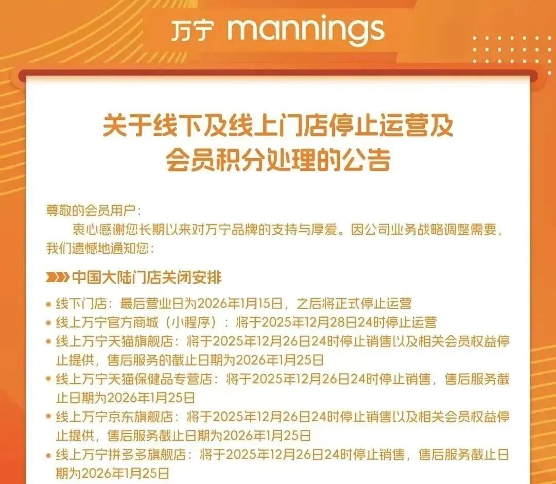 《新品略財(cái)經(jīng)》關(guān)注到,12月16日,萬寧中國官網(wǎng)發(fā)布了一則《關(guān)于線下及線上門店停止運(yùn)營及會員積分處理的公告》,宣布其線下門店最后營業(yè)日為2026年1月15日,之后將正式停止運(yùn)營。