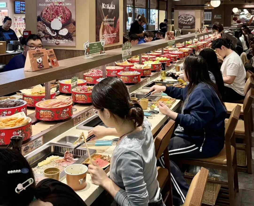 首先,它真正實現(xiàn)了從“一人食”到“多人聚”的全場景覆蓋。通過“吧臺+獨立小烤爐”設計,一人一爐,食材由傳送帶自動送達面前,無需起身、不用拼桌,既消除了獨食的孤獨感,也避免了社交壓力。這種低門檻、高自由度的用餐方式,顯著拓寬了客群邊界,不再只是朋友聚會的選擇,也成為上班族、學生黨日常解饞的輕松選項。
