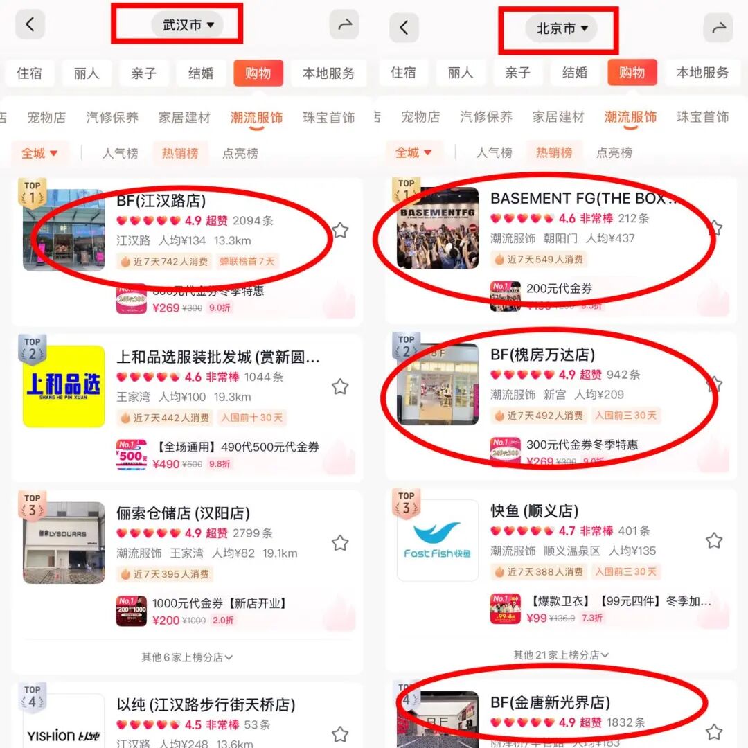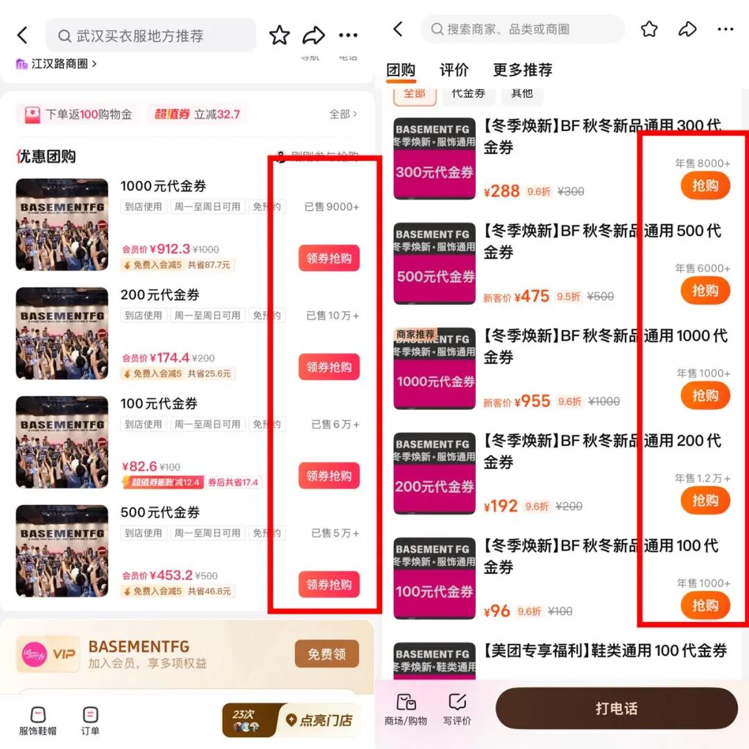 火爆的人氣,很大一部分來(lái)自本地生活平臺(tái)。Basement FG 200元的團(tuán)購(gòu)代金券售出超10萬(wàn)份;BF(江漢路店),工作日午后1小時(shí),店里仍有近百人挑選購(gòu)物,收銀臺(tái)擺放著團(tuán)購(gòu)券的二維碼,方便顧客買(mǎi)單。
