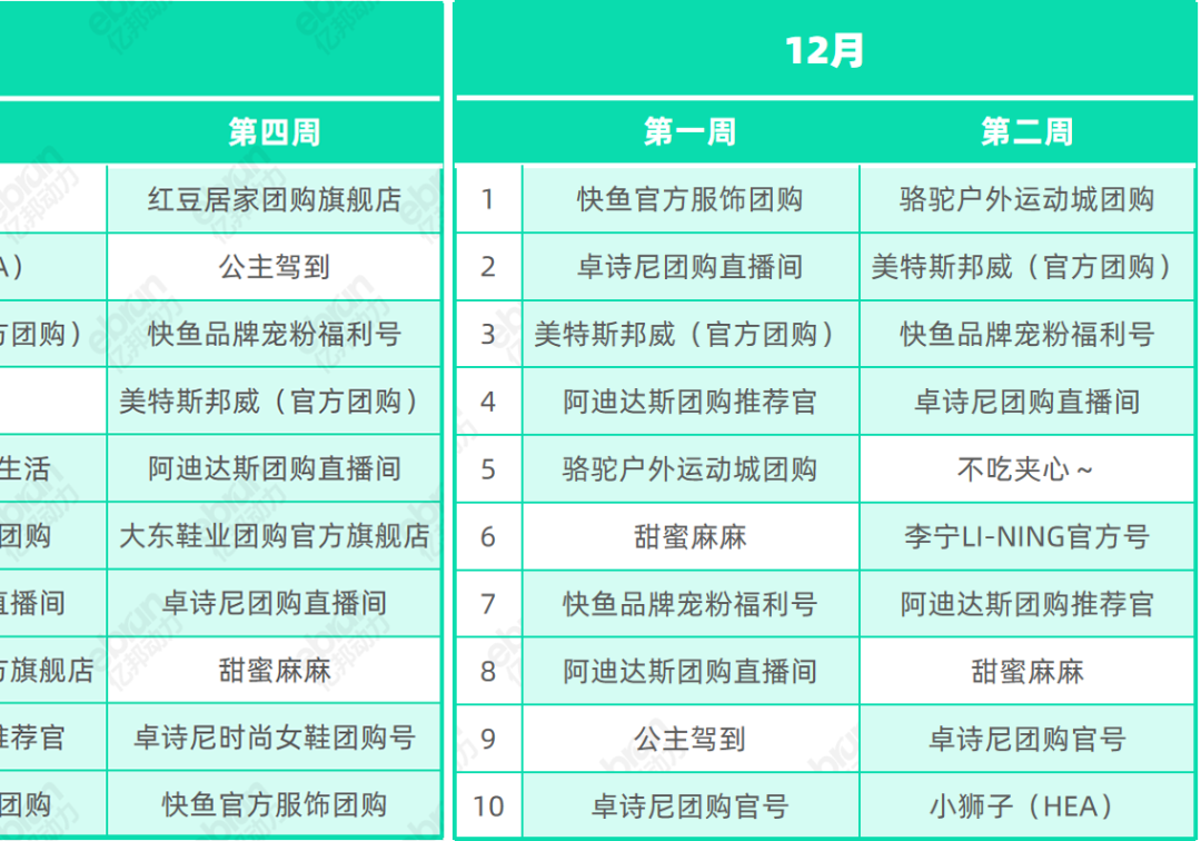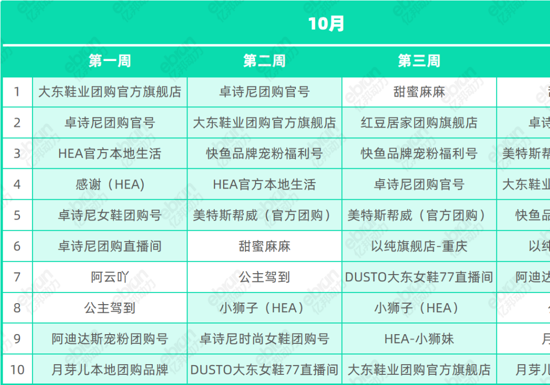 2025年第四季度,大東鞋業(yè)、卓詩(shī)尼、快魚(yú)、HEA、阿迪達(dá)斯、美特斯邦威、以純、紅豆......都通過(guò)這樣的方式,闖進(jìn)抖音生活服務(wù)全國(guó)潮流服飾榜。以下為榜單具體排名,其中標(biāo)綠賬號(hào)為品牌商家賬號(hào),其余為達(dá)人賬號(hào)。供大家參考: