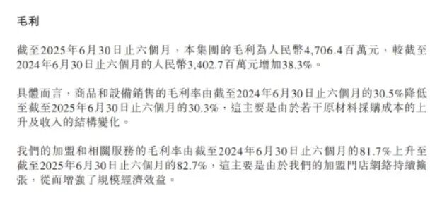 表面上看這項(xiàng)成績相當(dāng)亮眼,可同期的毛利增速僅為38.3%。在企業(yè)規(guī)模擴(kuò)大的情況下,規(guī)模效應(yīng)凸顯,單位成本下降,毛利增長應(yīng)該高于營收增速,但蜜雪冰城的核心業(yè)務(wù)“商品和設(shè)備銷售”的毛利率卻從2024年的30.5%掉到了30.3%。這意味著繁榮背后的利潤問題仍然有些局促。