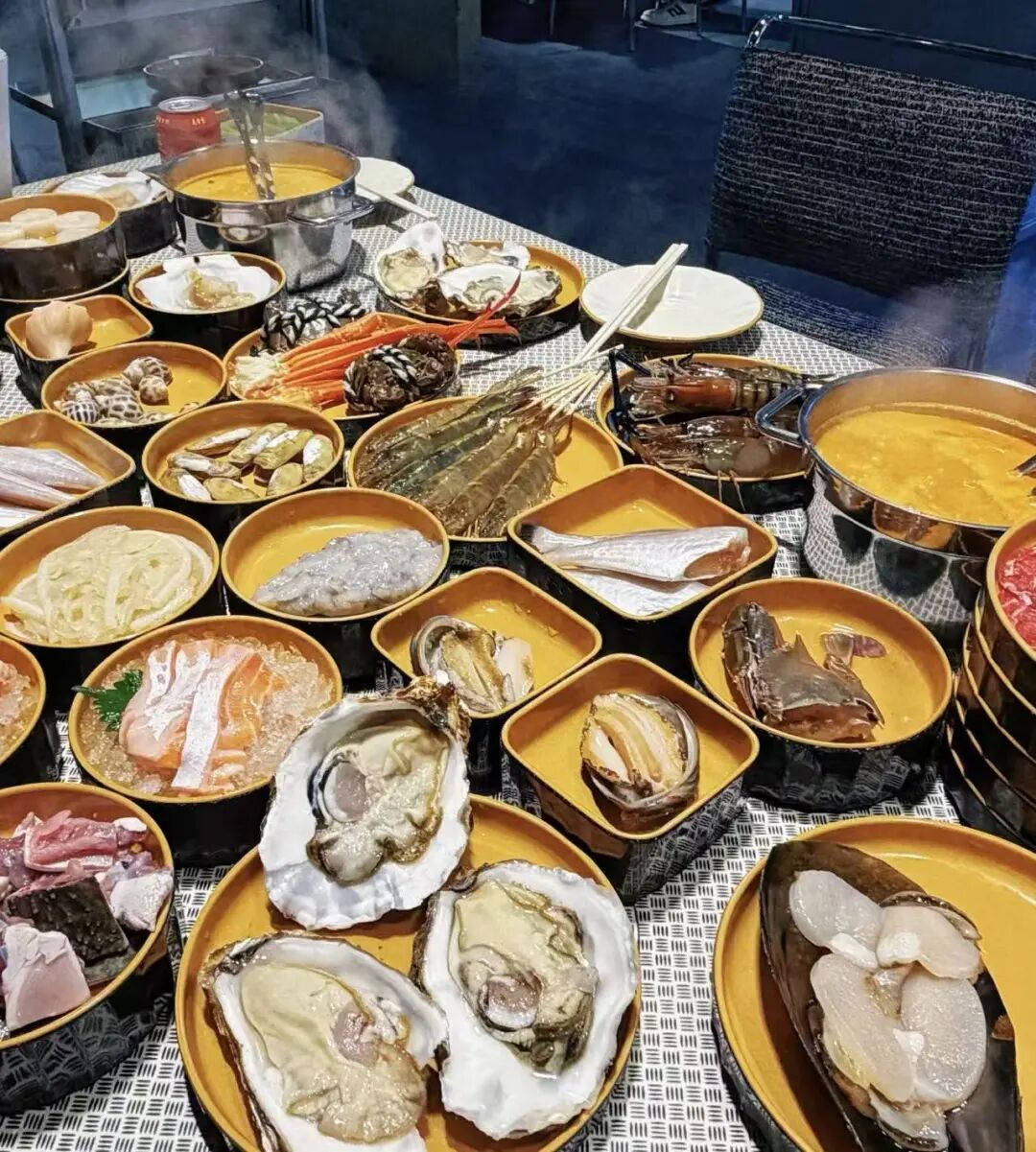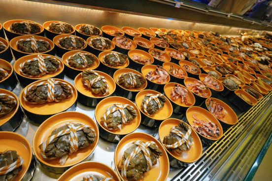菜品涵蓋大閘蟹、北極甜蝦、生蠔等鮮活海鮮,吊龍、肥牛等鮮切牛肉,以及鵝肝、刺身等多樣選擇。