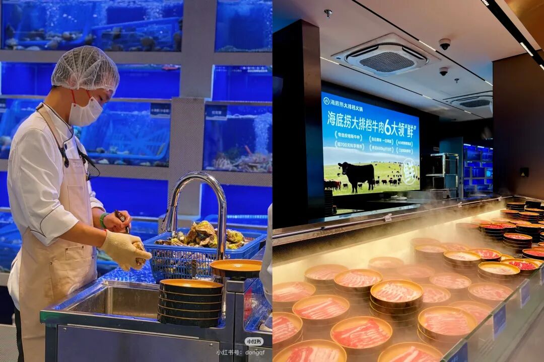 在品質(zhì)層面,門店主打海鮮、牛肉等高價值食材,并通過“海鮮現(xiàn)點現(xiàn)撈、牛肉現(xiàn)場鮮切”的明檔操作,強化“新鮮現(xiàn)制”的直觀感知,顯著提升消費體驗的價值感。