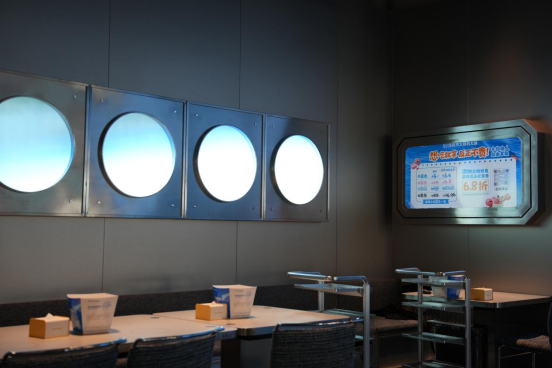 空間整體以藍(lán)色為主色調(diào),緊扣海鮮主題,在等位區(qū)與用餐區(qū)巧妙融入金屬“舷窗”元素,并搭配靈動的光影效果,營造出別具一格的“海鮮集市”氛圍。