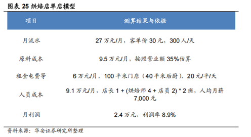 華安證券在一份行業(yè)研報中,以一間約100平方米的城市烘焙店為例測算,在月流水27萬元的前提下,原料成本按營業(yè)額35%估算約為9.5萬元,租金及水電約6萬元,人員成本約9.1萬元,門店最終月利潤只有約2.4萬元,對應(yīng)利潤率約8.9%。