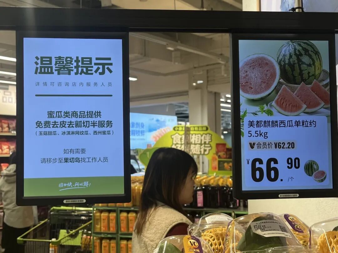 與胖改店一樣,小象超市也會(huì)展示一些小Tips,來(lái)強(qiáng)化其服務(wù)屬性。一類是介紹選購(gòu)經(jīng)驗(yàn),比如不同種類香蕉的特點(diǎn),牛排的不同部位應(yīng)該怎么選。另一類則是通過(guò)顯眼的標(biāo)牌提示消費(fèi)者可以免費(fèi)享受牛排代煎、蜜瓜去皮去瓤等服務(wù)。還有一類是請(qǐng)消費(fèi)者對(duì)服務(wù)多包涵,這在胖改店也很常見。