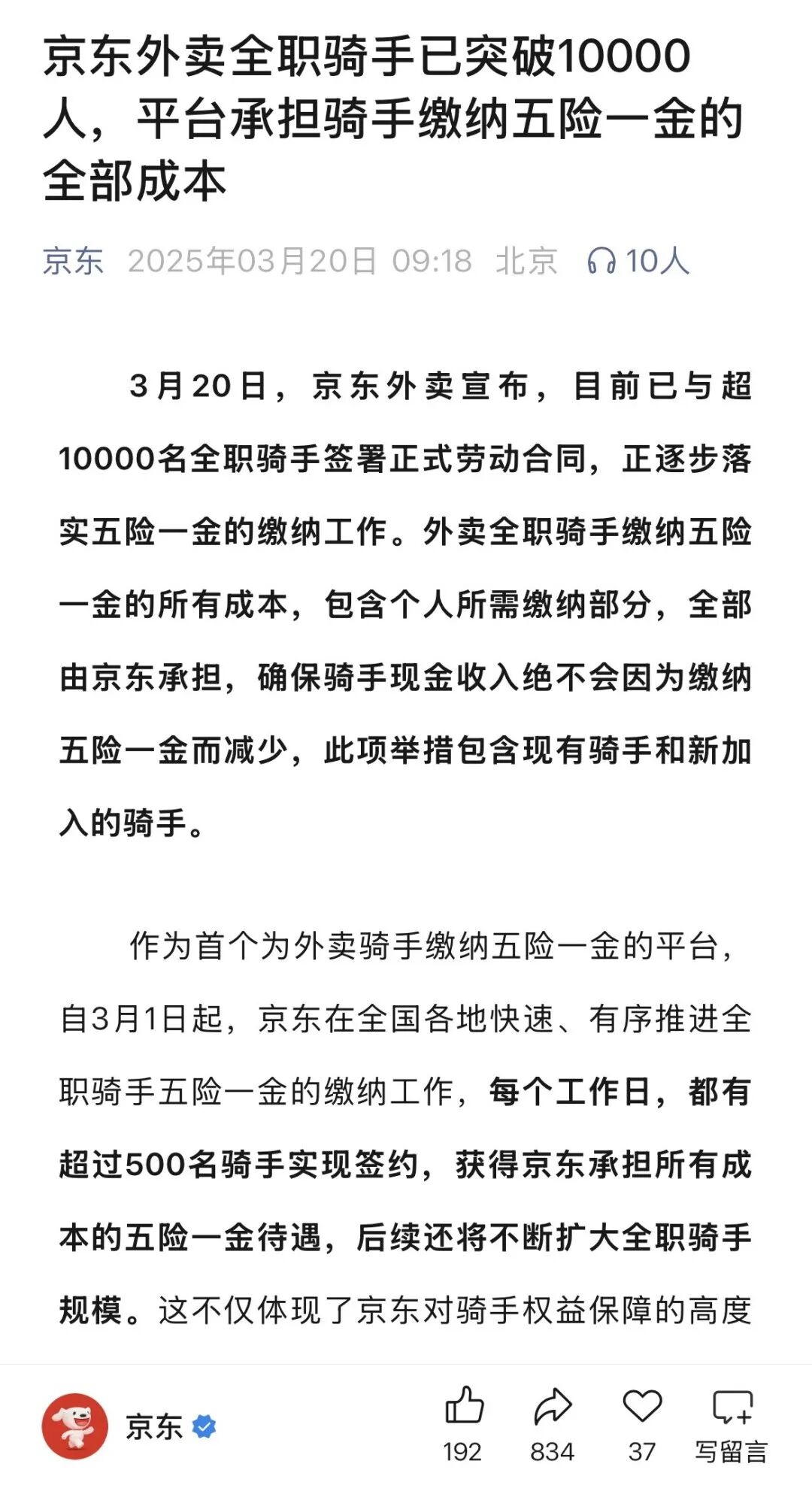 另外,京東為全職騎手繳納五險(xiǎn)一金,這在行業(yè)內(nèi)創(chuàng)下先例,不僅為平臺(tái)打下了服務(wù)根基,也提升了騎手隊(duì)伍的穩(wěn)定性與服務(wù)質(zhì)量。