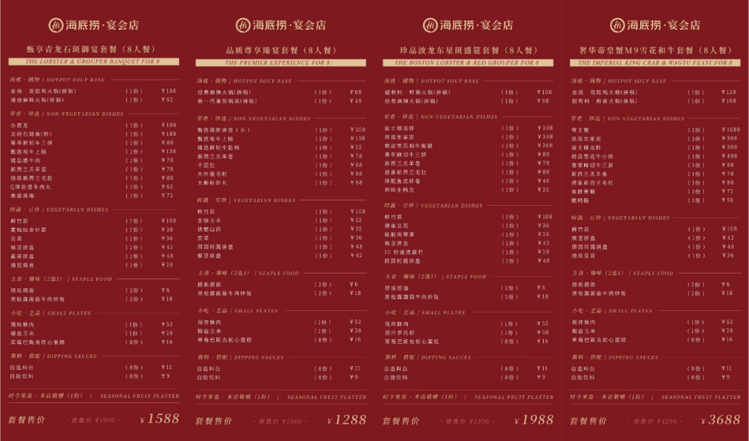 其中,1288元套餐已包含臻選海鮮拼盤(。、牛上腦、羔羊卷、千層肚等7款肉品及6款素菜;更高價(jià)位的套餐則進(jìn)一步引入帝王蟹、波士頓龍蝦、東星斑等高端海鮮,以滿足對(duì)宴席規(guī)格有更高要求的場(chǎng)景。