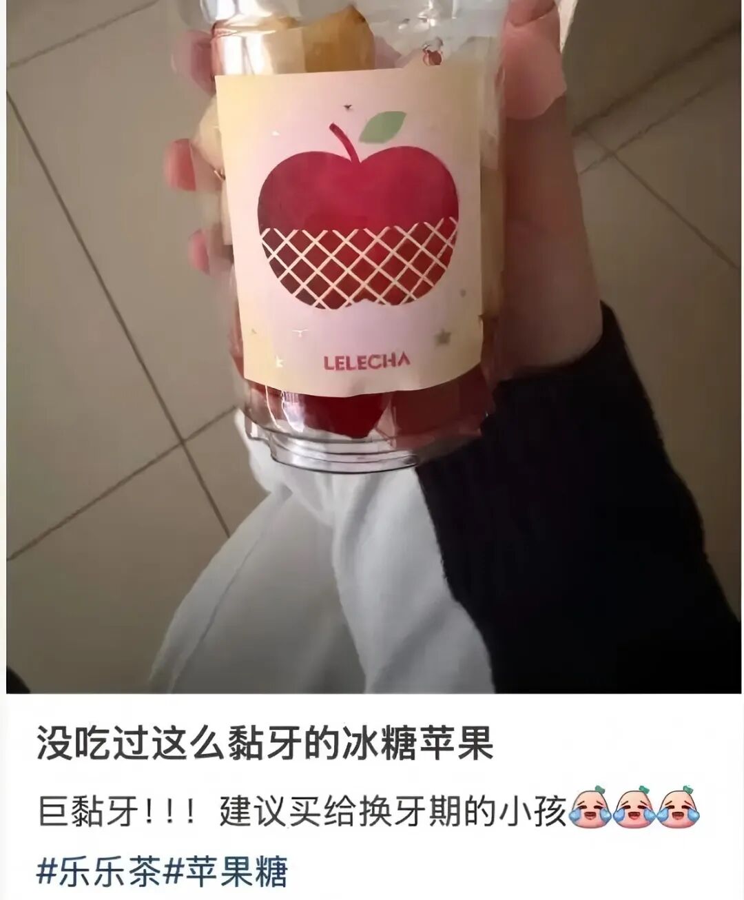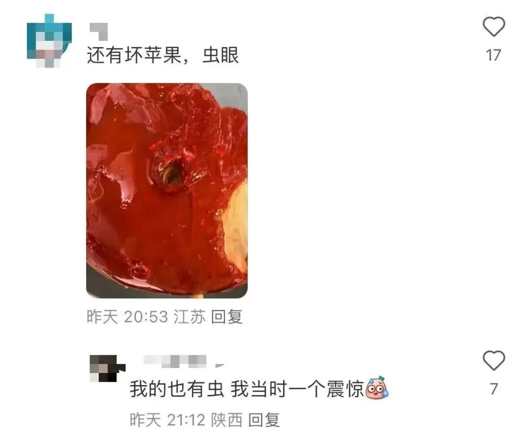 根據(jù)網(wǎng)友的分享,樂樂茶這款新品存在糖漿包裹不均、口感過粘、蘋果氧化等問題。有人曬出了沒有裹糖的蘋果,在線求助“我的糖呢?”;有人則吐槽,“沒吃過這么粘牙的冰糖蘋果,建議買給換牙期的小孩”。