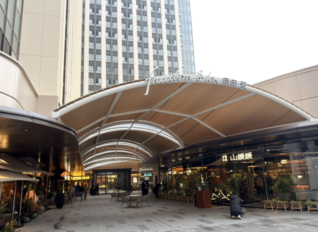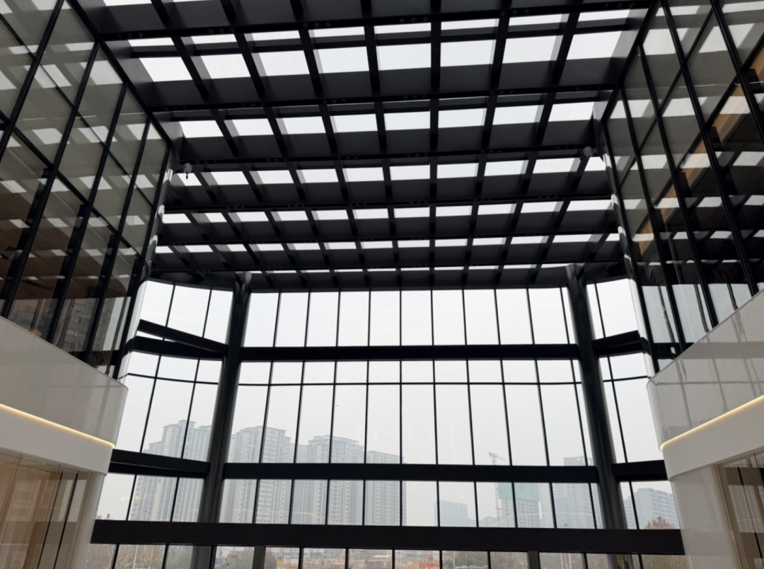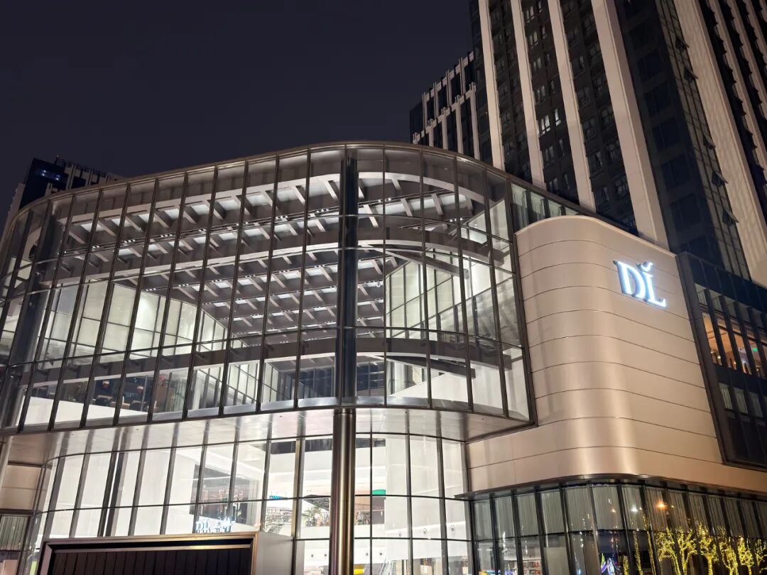 三胖項目外觀以弧形玻璃幕墻搭配金屬線條,通透感十足;內部挑高空間輔以格柵式頂構,簡潔中透著秩序感,燈光點綴更添精致;整體以“通透外殼+簡潔內構”的組合,既契合城市商業(yè)體的現(xiàn)代質感,又融入了藝術化的空間層次,讓建筑既具城市地標性,又有舒適的空間體驗。