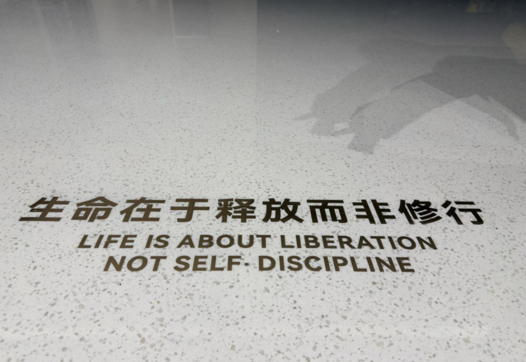 在三胖,不論在地面還是在墻上,隨處可見各種中英雙語的文化標語,諸如“自由·愛”“發(fā)自內心的喜歡高于一切”“生命在于釋放而非修行”以及“每天的生活,每天的愛”和幸福人十條標準等等。