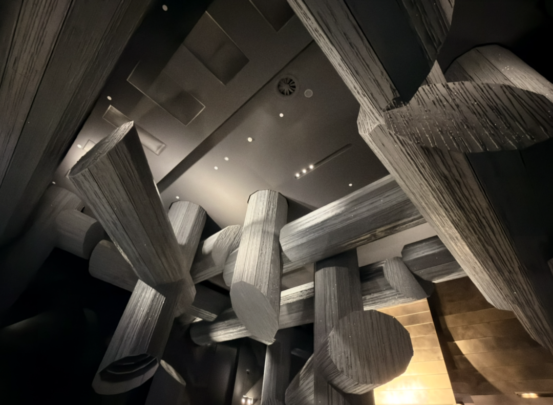 DL胖東來影城位于項目四層,頗具藝術風格的大廳瞬間將人帶入一個充滿呼吸感的“城市森林”。設計師羅靈杰以新鄉(xiāng)“國家森林城市”為靈感,將森林意象融入公共區(qū)域。大堂以橫豎交錯的十二邊形圓柱為視覺核心,其表面模擬樹皮質感,形同挺拔樹干。燈光下,柱體紋理隨光影產生層次變化,營造出“置身林間”的沉浸氛圍。這一設計既巧妙融合了自然美學與建筑結構,也以強烈的敘事感讓顧客在步入瞬間便能感受到森林般的靜謐與舒緩。