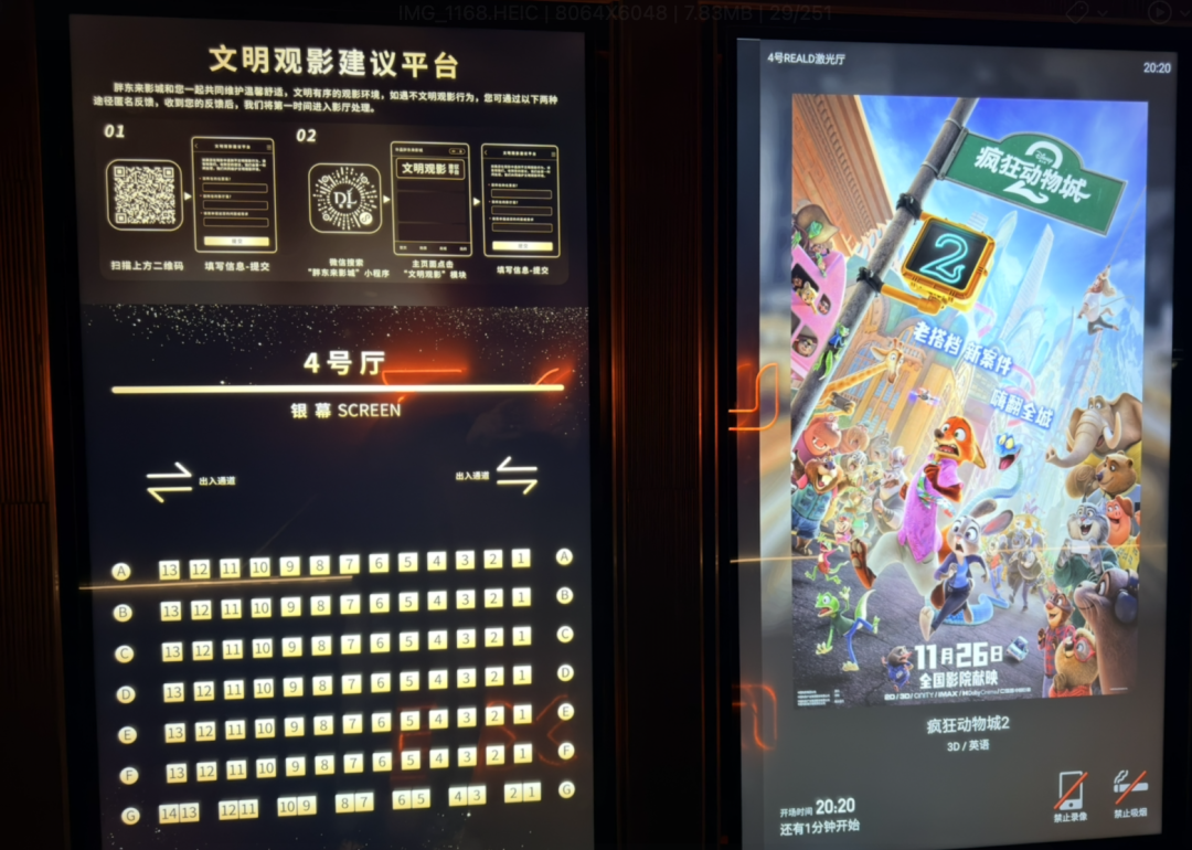 在胖東來影城各放映廳入口,細節(jié)設計同樣貫徹了“胖東來式”的預見性服務。電子展示牌上,廳內座位圖與影片放映倒計時等信息一目了然。尤為特別的是,胖東來設置的“文明觀影建議平臺”,巧妙地把沖突處理從被動響應轉向了主動預防。
