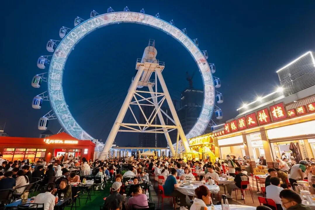 繼續(xù)向上,北座9層煥新的“夜食天臺”,借助著屋頂摩天輪這一標(biāo)志性景觀,以11家煙火餐廳的引入,打造出了針對年輕夜貓子們的休閑場景。