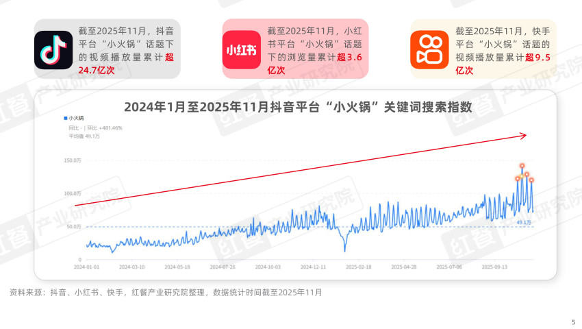 在巨量算數(shù)平臺上,“小火鍋”關(guān)鍵詞搜索指數(shù)從2024年初的不到50萬提升至2025年11月的150萬左右。同時,在各個社交平臺上,“小火鍋”相關(guān)話題也獲得了較高的熱度。比如截至2025年11月,“小火鍋”話題在小紅書瀏覽量累計超3.6億次,相關(guān)視頻播放量在快手、抖音分別超9.5億次和24.7億次。