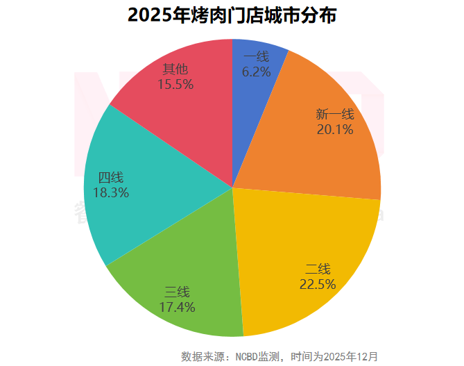 3、從城市分布來看,二線城市烤肉門店數(shù)最多,占全國總量的22.5%;其次是新一線城市,占比20.1%;三四線及以下的城市烤肉店數(shù)量占比51.2%。近年來,烤肉消費(fèi)下沉趨勢明顯,下沉市場門店增速明顯