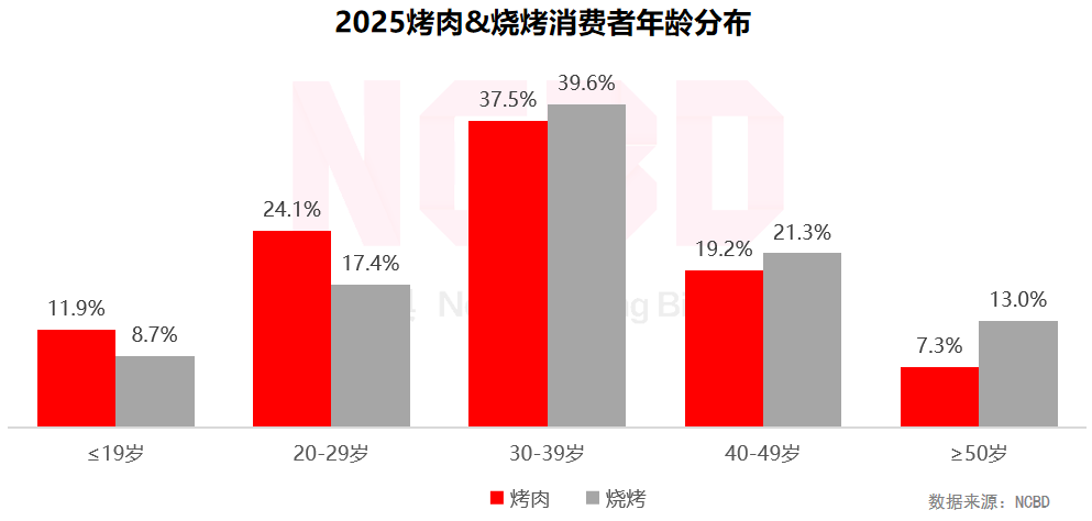 1、從年齡來看,20—39歲的群體是烤肉消費(fèi)的主力軍,占比超過 60%。其中,30—39歲年齡段消費(fèi)者占比為37.5%,20—29歲年齡段占比為24.1%。與燒烤烤串相比,烤肉的消費(fèi)者更為年輕化