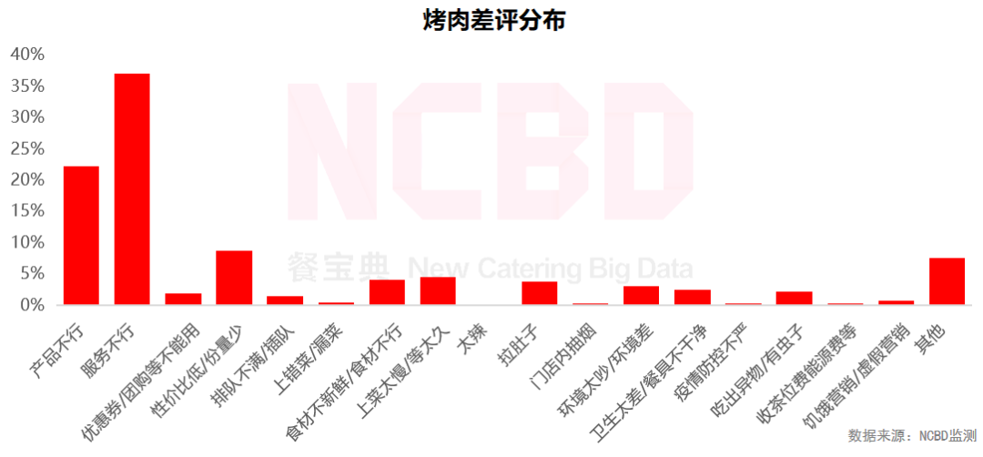 5、在關(guān)于烤肉的差評中,服務(wù)方面差評最多,占比高達(dá)37.0%,遠(yuǎn)高于燒烤烤串;此外,產(chǎn)品、性價比以及食材方面也收獲了較多差評