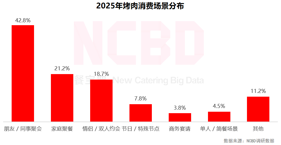 3、烤肉具有鮮明的社交屬性:朋友/同事聚餐占比42.8%,家庭聚餐占21.2%,情侶/雙人約會占18.7%,商務(wù)宴請的比例僅為3.8%