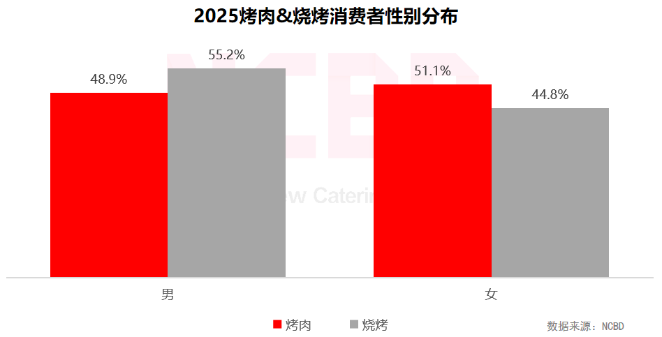 2、從性別來看,女性消費(fèi)者在烤肉消費(fèi)中占比略高,達(dá)到51.1%,男性占比48.9%。與燒烤相比,烤肉的女性消費(fèi)者比例更高