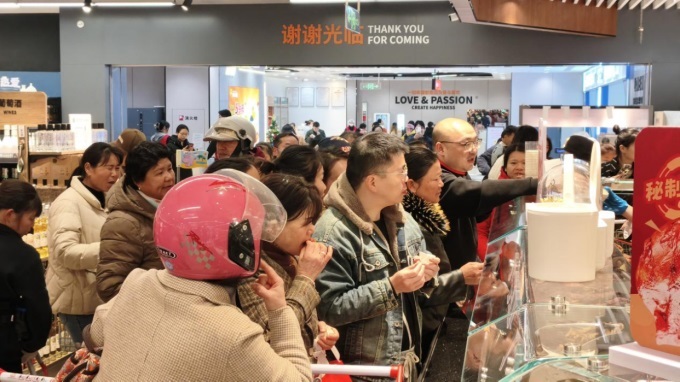 現(xiàn)場加工與餐飲化體驗成為新亮點。調(diào)改后,店內(nèi)烘焙與熟食的占比從原有的約5%增長至20%左右,現(xiàn)場制作檔口大幅增加,除了原有的烘焙現(xiàn)烤區(qū)外,新增了現(xiàn)做的包子、鮮肉餅,以及烤雞、現(xiàn)炸水餃等熱門即食商品,煙火氣滿滿。烘焙區(qū)新增了大量SKU,在延續(xù)網(wǎng)紅品如山茶花山泉吐司、半斤榴蓮肉榴蓮千層、核桃滿滿的同時,亦結(jié)合冬季草莓季,推出了如“草莓奶油盒子蛋糕”等時令主題產(chǎn)品。