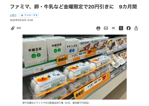 根據(jù)《日本經(jīng)濟新聞》當(dāng)時的報道,全家FamilyMart宣布從5月23日起,連續(xù)九個月、每周五固定對雞蛋、牛奶、豆腐、納豆等11項民生日用品給予20日元折扣,這些都是家庭生活中不可或缺的基礎(chǔ)食材。
