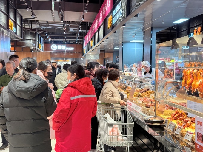 熟食烘焙煙火氣足:熟食區(qū)匯聚了撈汁小海鮮、鍋包肉、奧爾良烤雞等,并特別引入蕪湖紅皮鴨、鹵鵝等本地特色,以及冰糖葫蘆等地方小吃。
